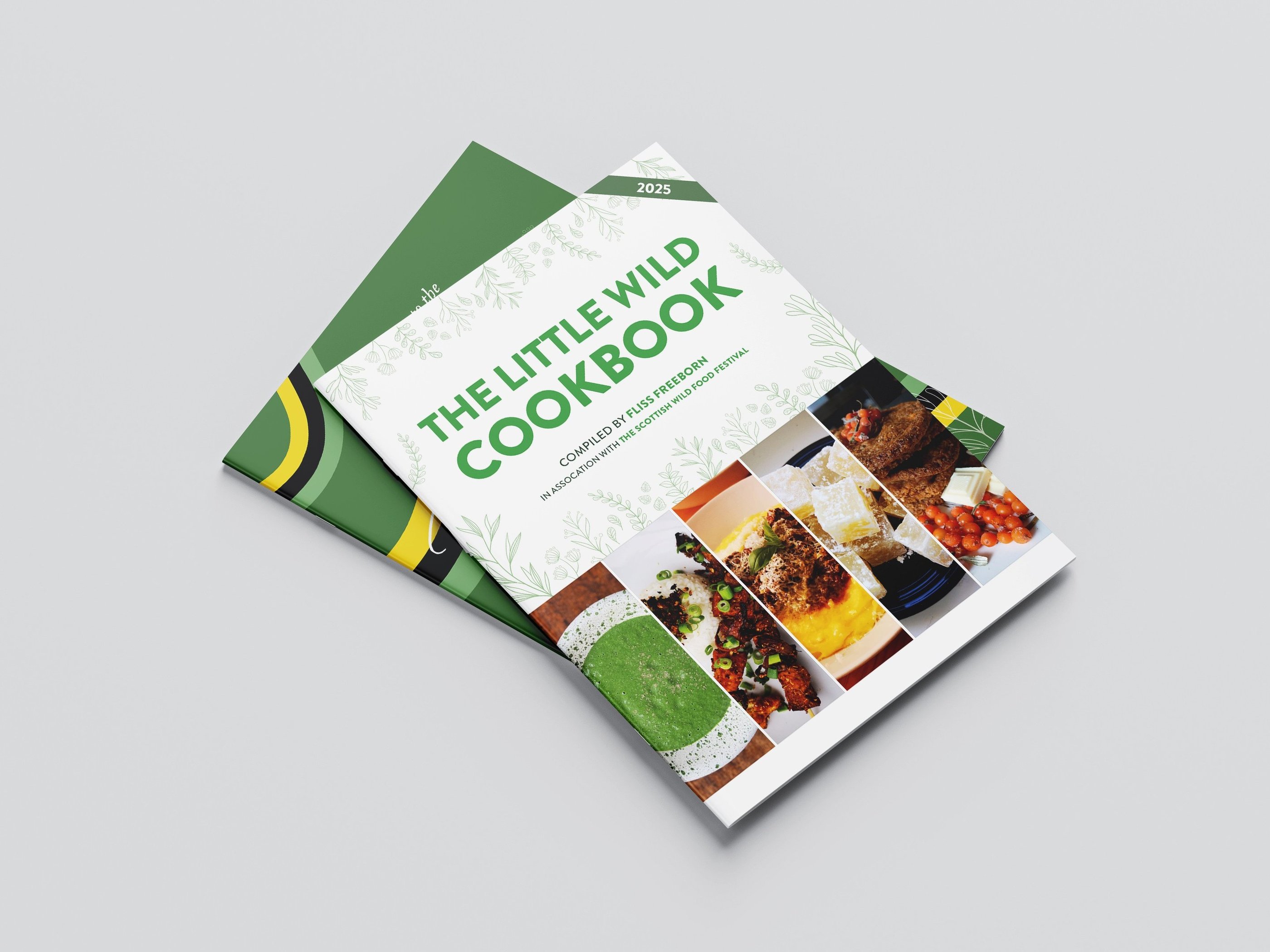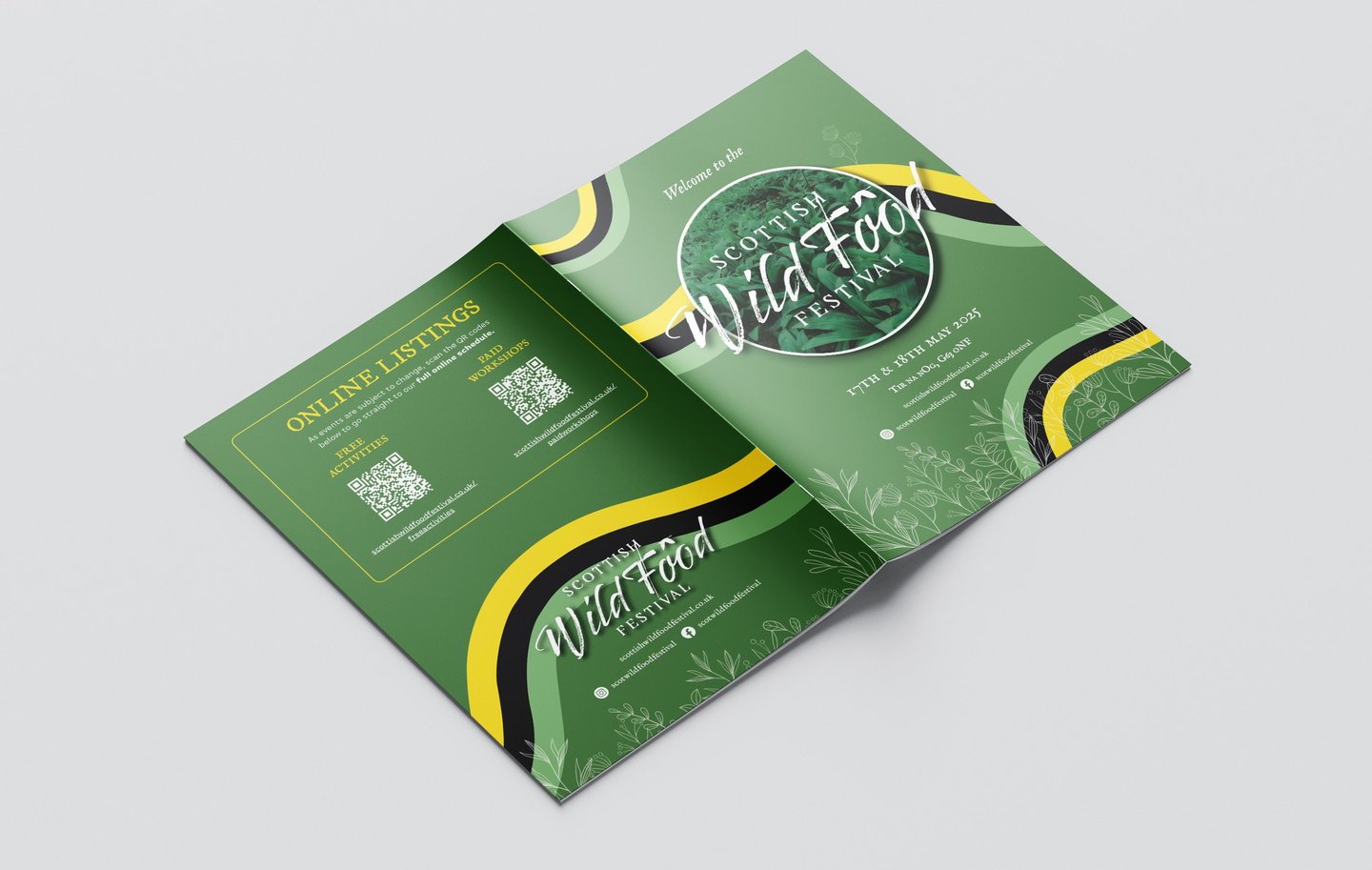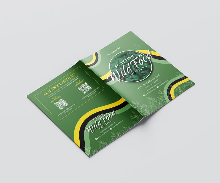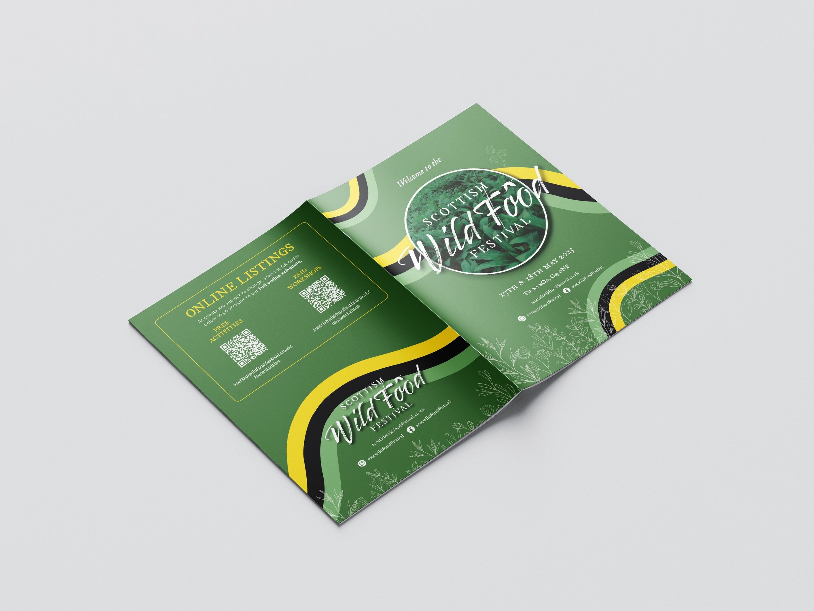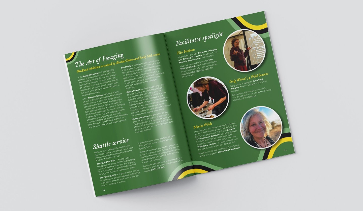 I've designed three festival programmes for the Scottish Wild Food Festival, a celebration of wild food foraging and cooking that takes place every year, about 40 miles outside Glasgow. In 2024 the brief expanded to include The Little Wild Cookbook, featuring wild food recipes from noted wild food chefs. The design for the 2025 programme was inspired by the bold yellow, black and green stripes the Festival had already established in their social media. The big challenge is keeping on top of the fast moving list of vendors and demonstrators, as the festival always has a packed schedule.